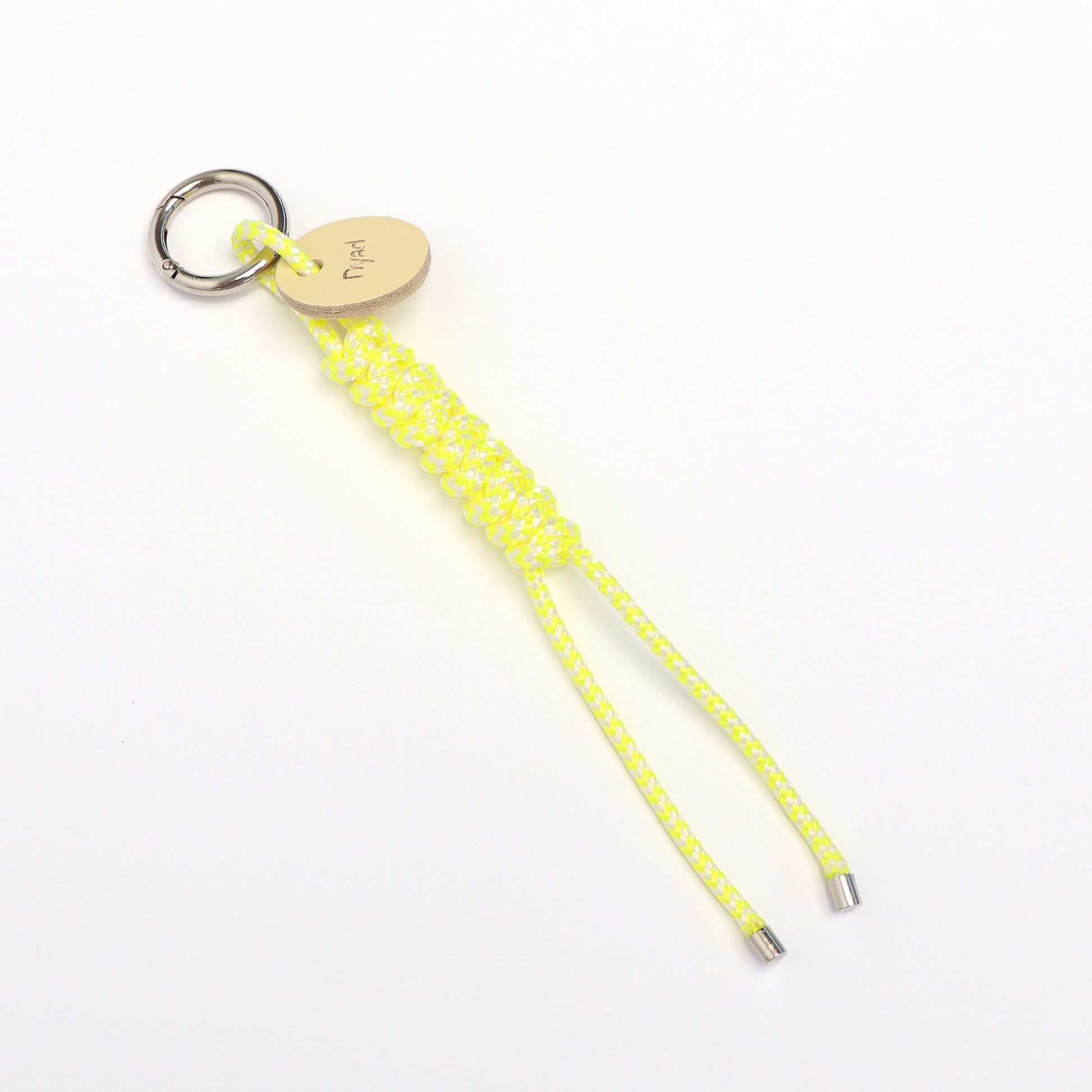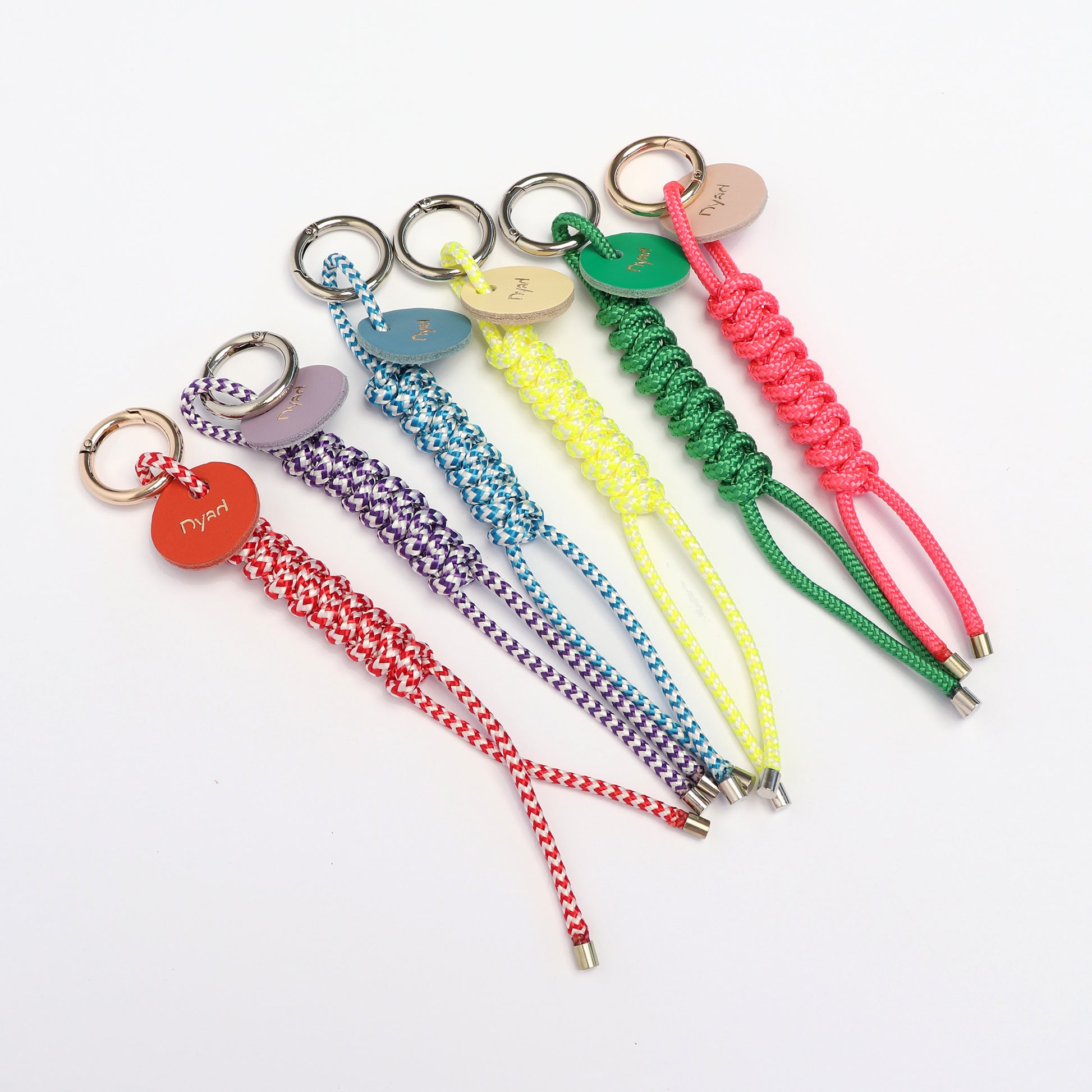 Braided rope is attached to a gold carabiner ring which can be easily attached to a bag strap, keys etc.