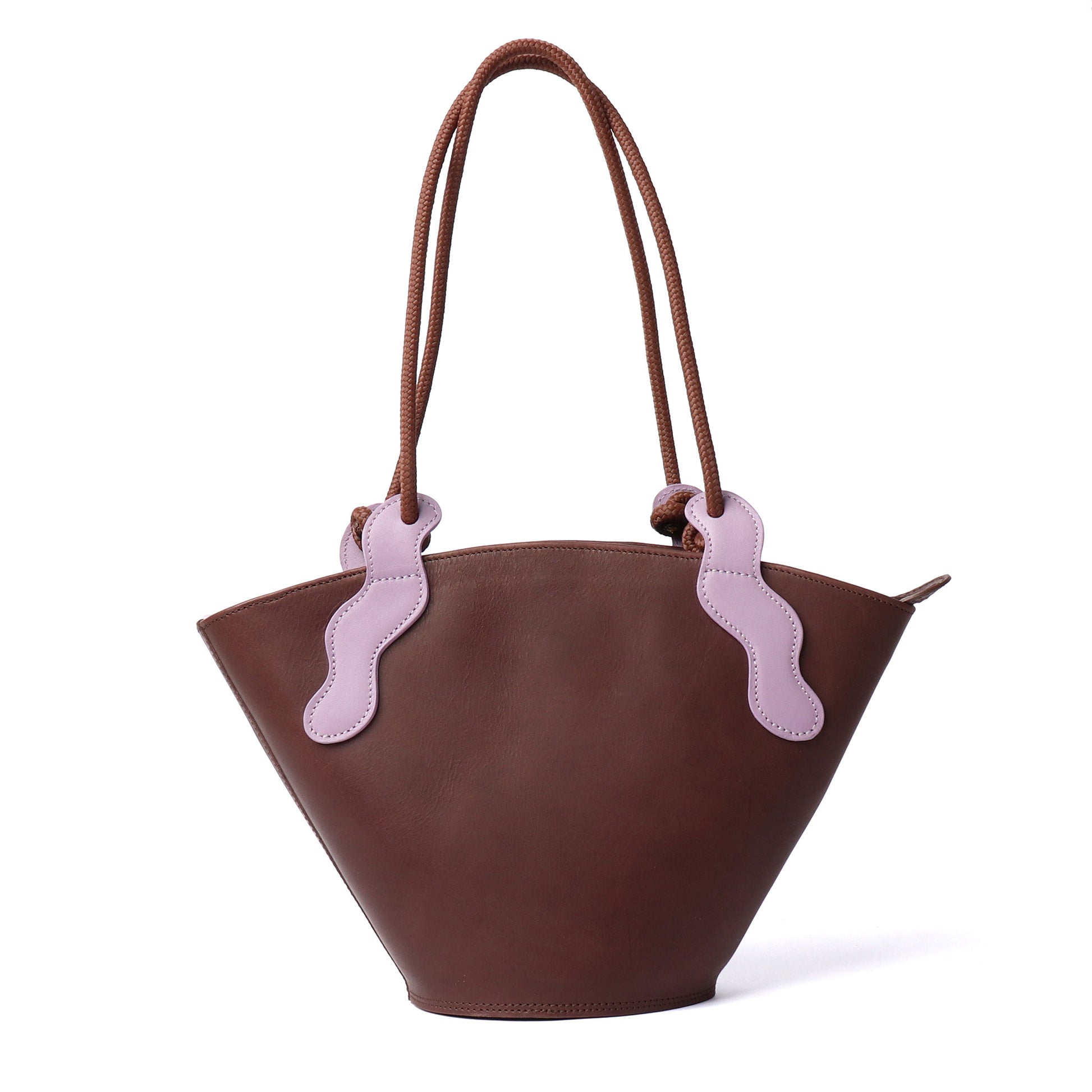 A trapeze shaped cow leather bag inspired by a basket. The bag has a structured oval base and rope shoulder straps which attach to the bag by knotting them to wavy leather pieces. The bag closes securely with a zip and comes with a small slip pocket on the inside as well as a leather label with a gold embossed Dyad logo. YKK zip.