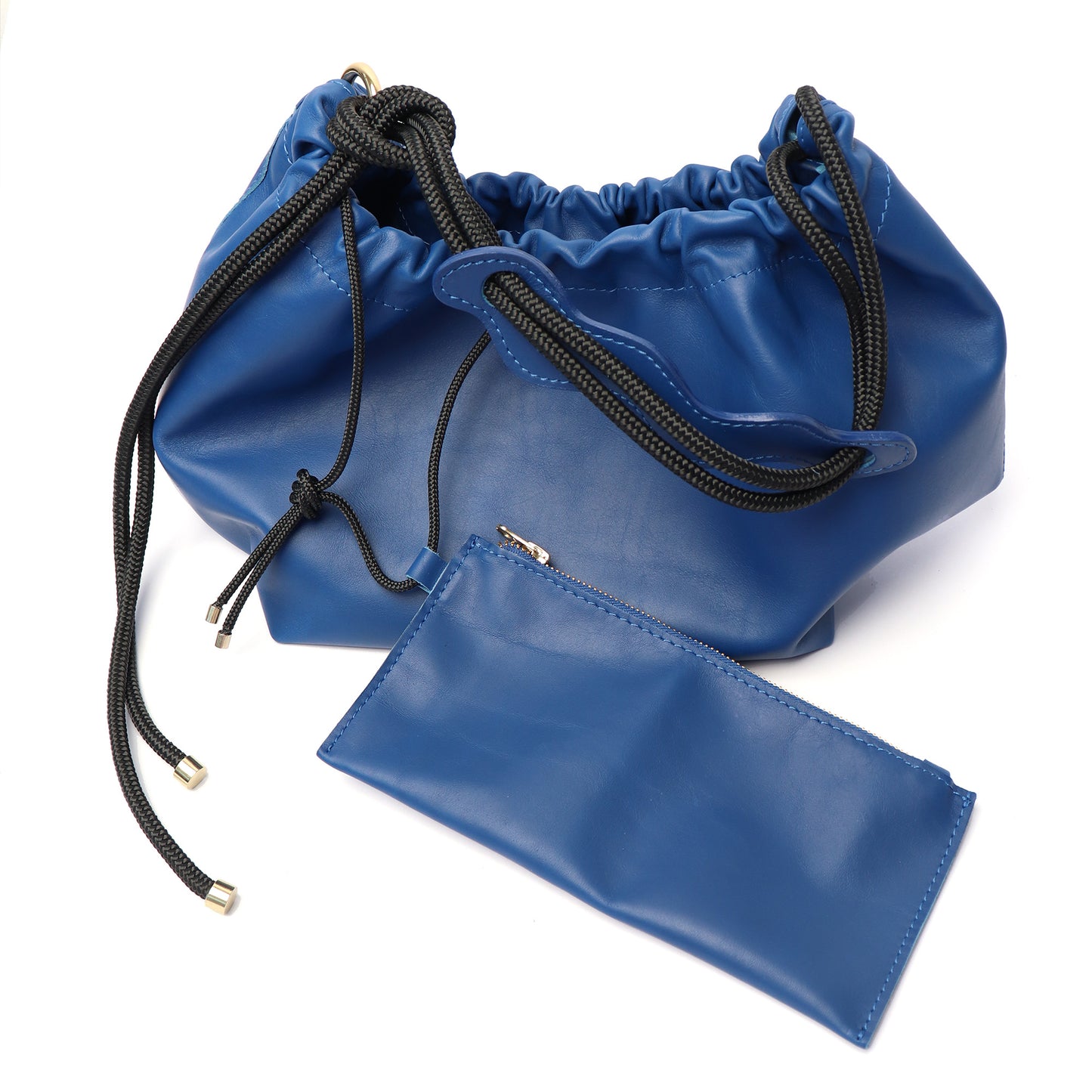 Medium sized cow leather shoulder bag featuring ruched detail at the top, an asymmetrical knotted strap and a magnetic fastening that reveals a spacious interior. The length of the strap can be adjusted by knotting it on the outside. Comes with a small detachable zip pouch and wave detailed shoulder piece. Gold embossed Dyad logo. YKK zip.