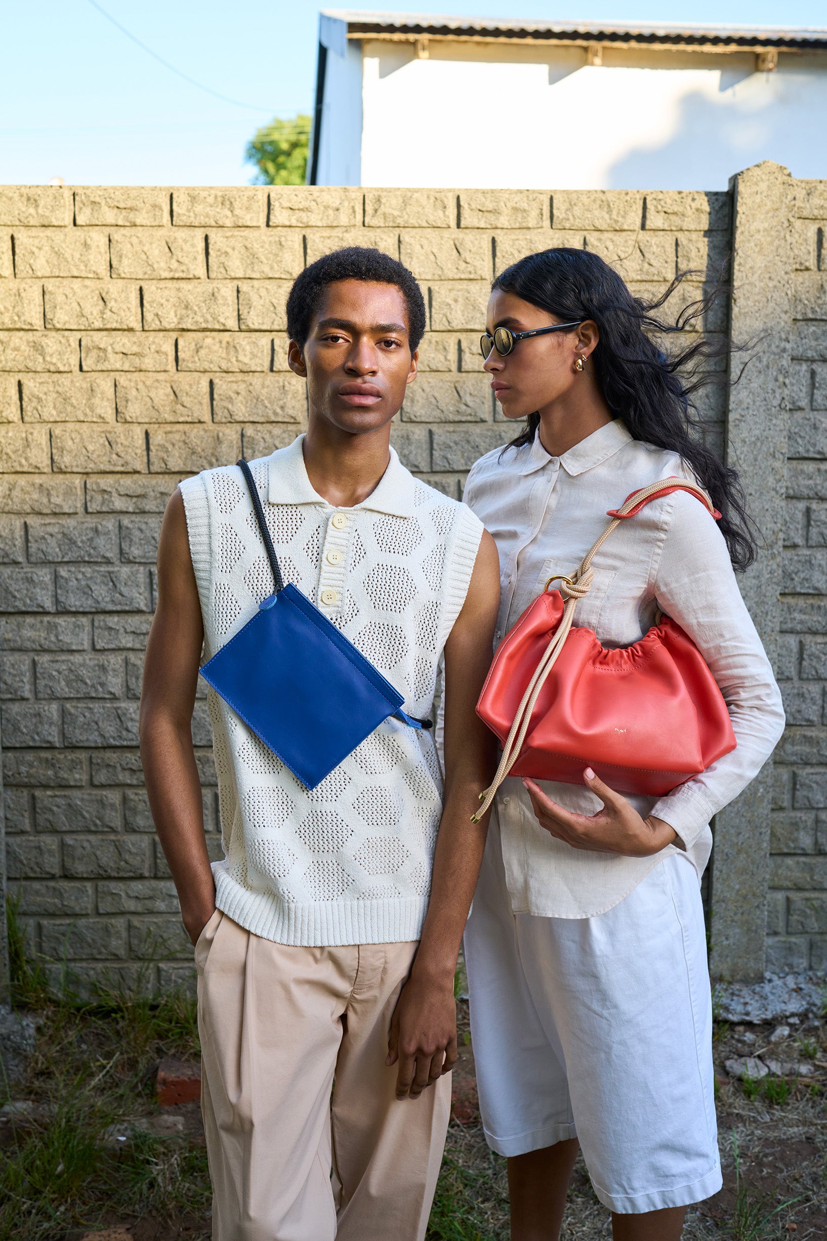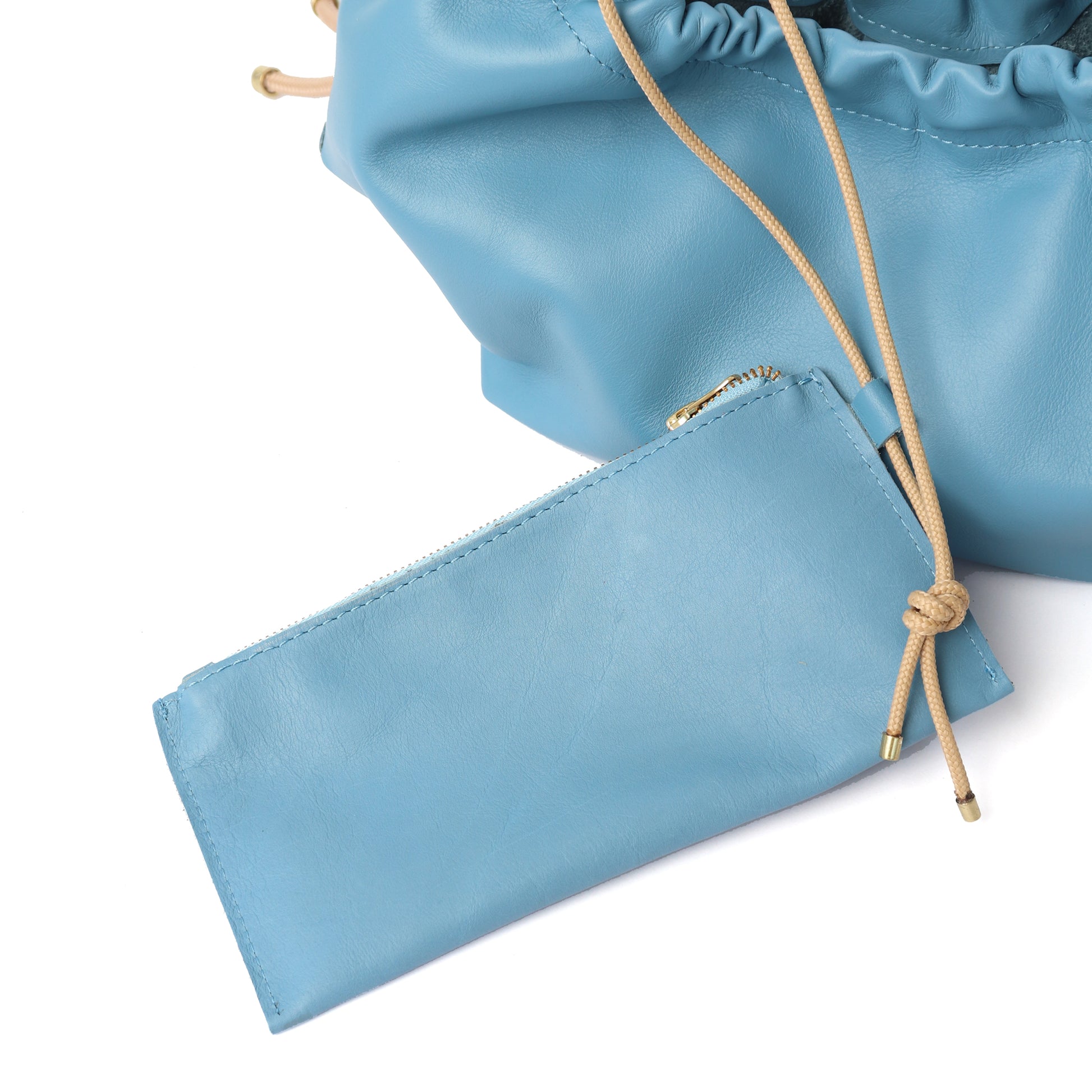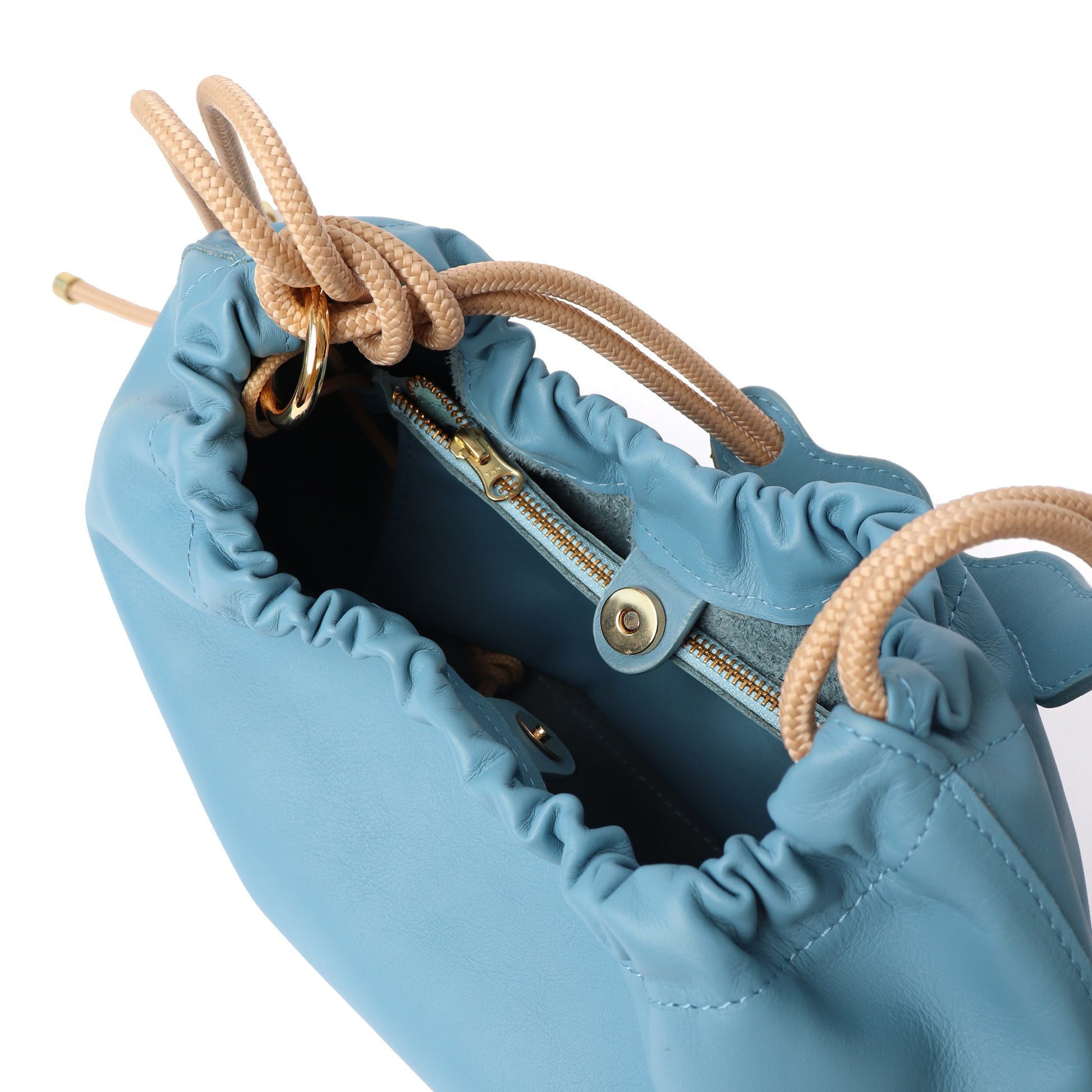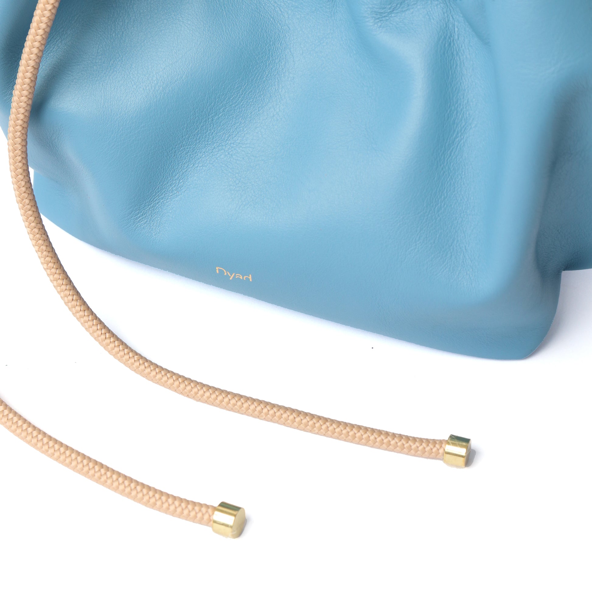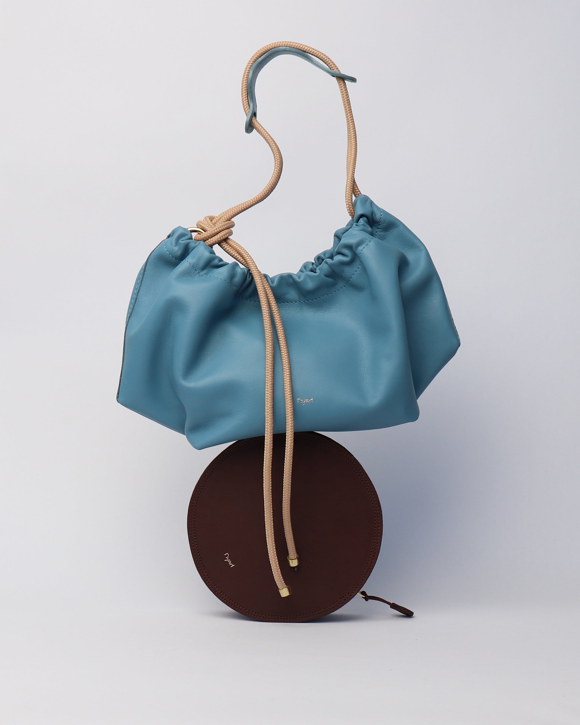 Medium sized cow leather shoulder bag featuring ruched detail at the top, an asymmetrical knotted strap and a magnetic fastening that reveals a spacious interior. The length of the strap can be adjusted by knotting it on the outside. Comes with a small detachable zip pouch and wave detailed shoulder piece. Gold embossed Dyad logo. YKK zip.
