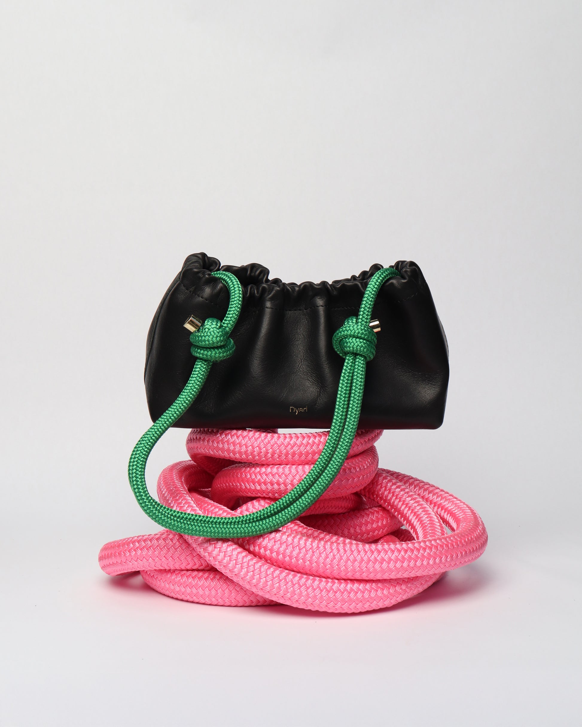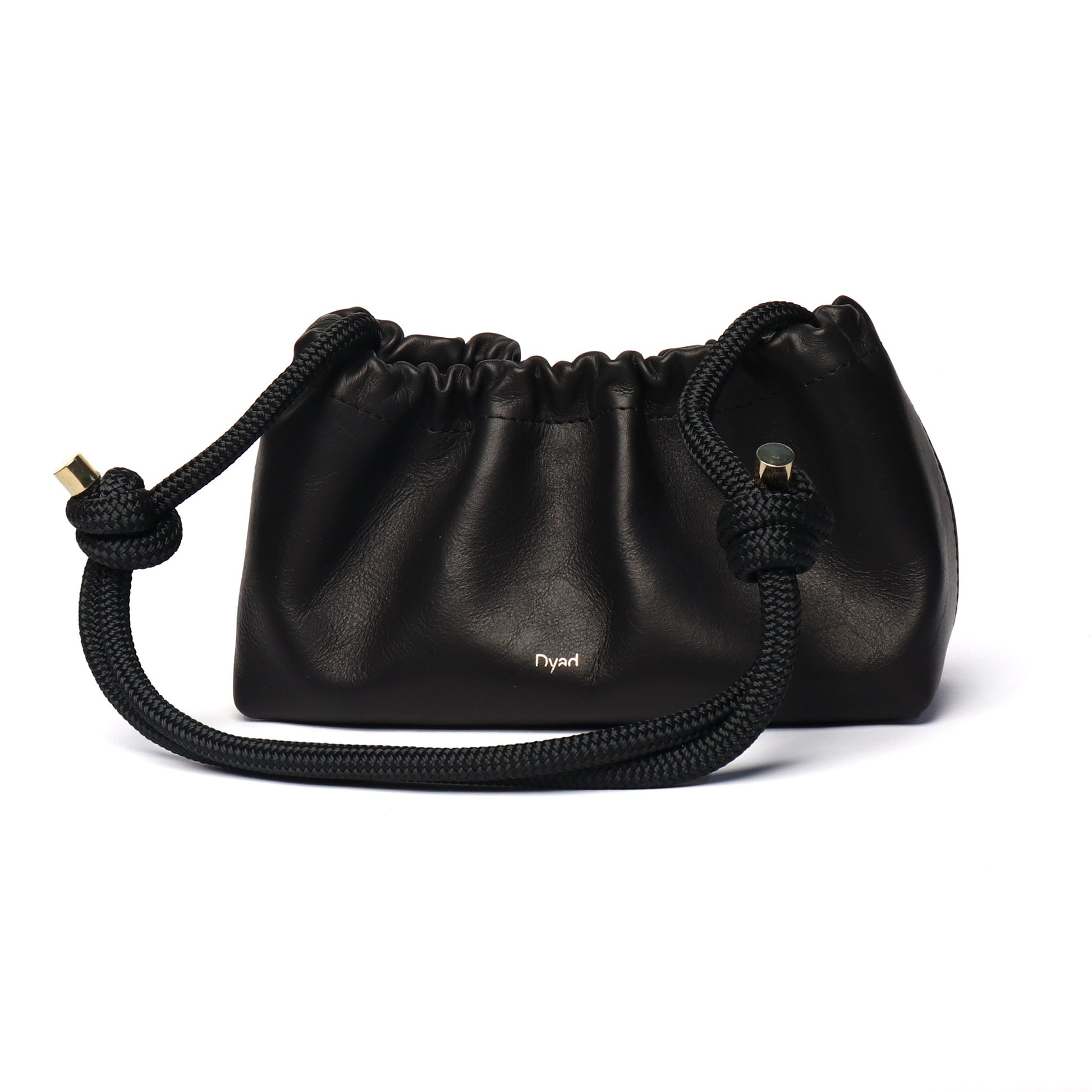 Small, yet spacious cow leather sling bag with ruche detail on the top and a striking chunky rope strap. The length of the strap can be adjusted by moving the knots up or down so that the bag can be worn crossbody or as a shoulder bag. The rope ends are finished off with gold metal caps.