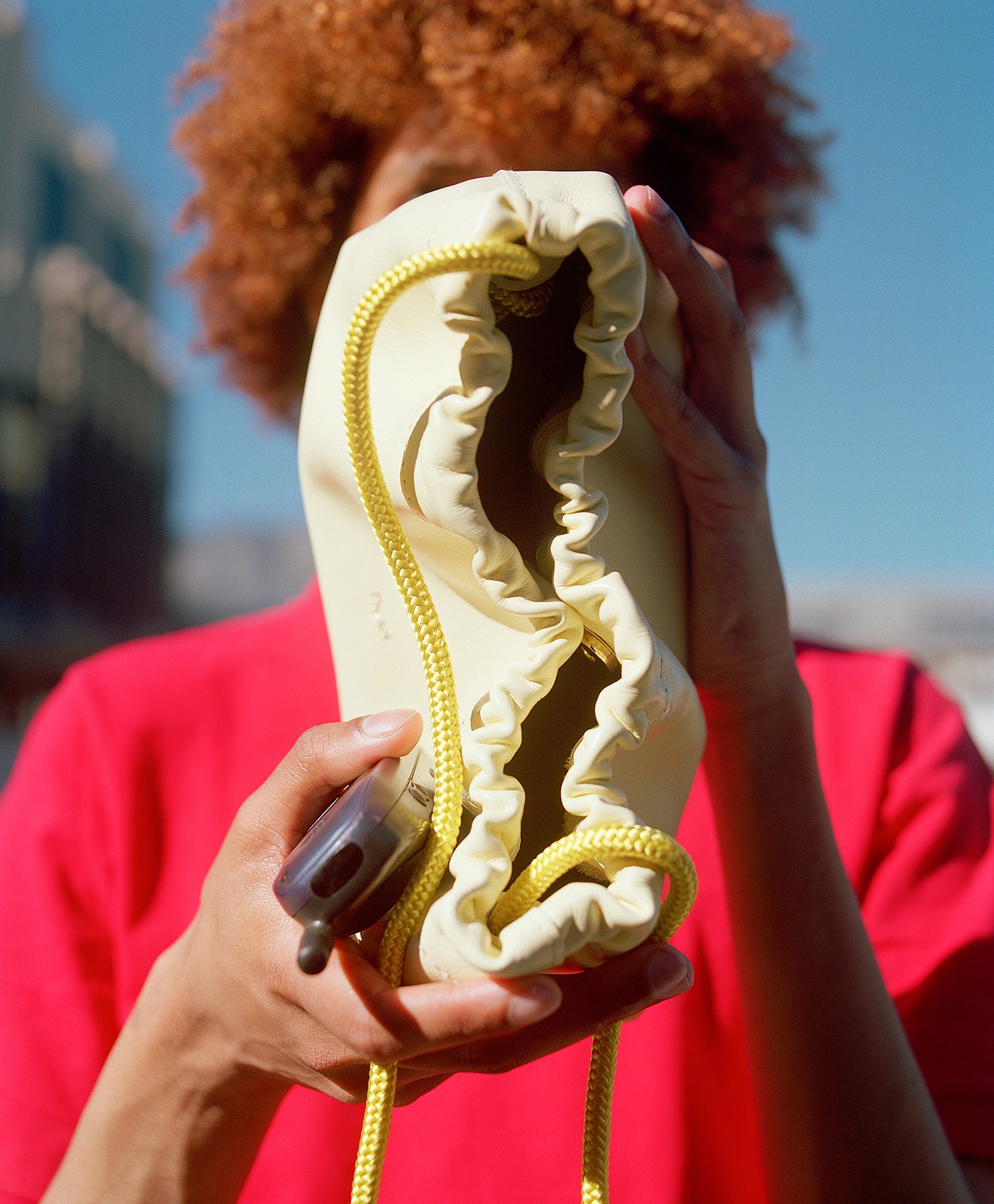 Small, yet spacious cow leather sling bag with ruche detail on the top and a striking chunky rope strap. The length of the strap can be adjusted by moving the knots up or down so that the bag can be worn crossbody or as a shoulder bag. The rope ends are finished off with gold metal caps.