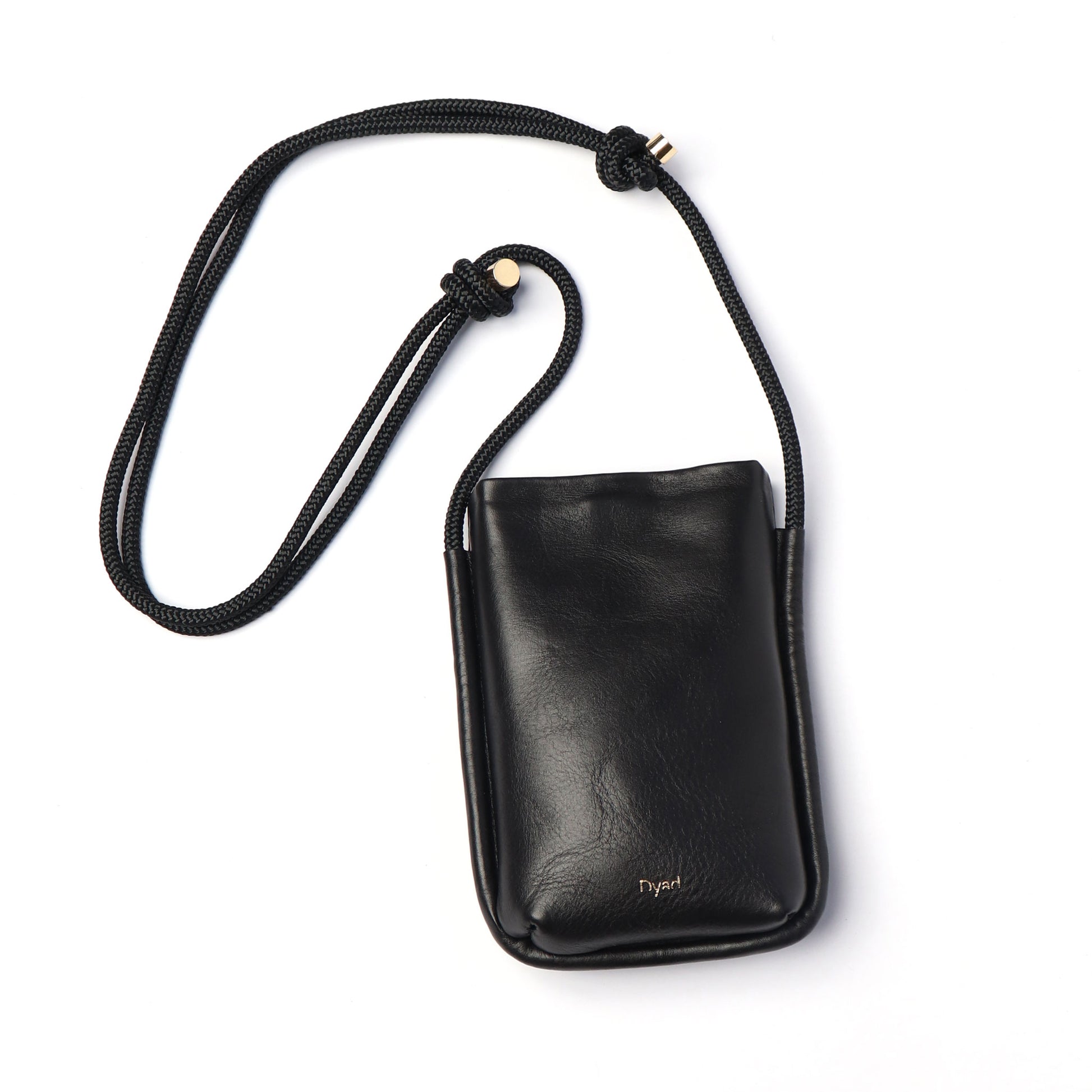 An ideal mini crossbody bag made to carry all the essentials. Made from cow leather and finished off with an adjustable rope strap. The length of the strap can be adjusted by moving the knots up or down so that the bag can be worn crossbody or as a shoulder bag. Features edge piping detail, a magnetic lock fastening and gold embossed Dyad logo.