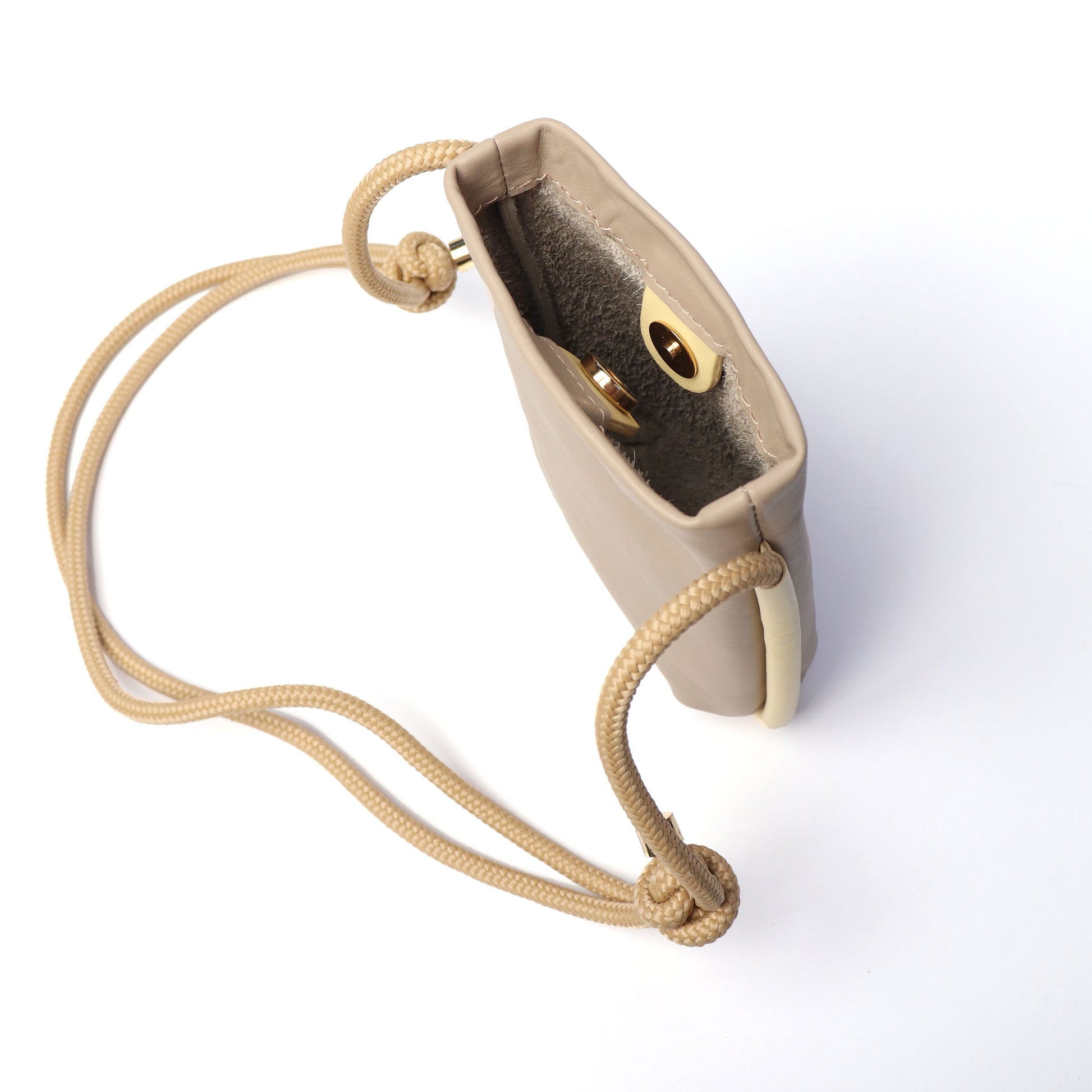 An ideal mini crossbody bag made to carry all the essentials. Made from cow leather and finished off with an adjustable rope strap. The length of the strap can be adjusted by moving the knots up or down so that the bag can be worn crossbody or as a shoulder bag. Features edge piping detail, a magnetic lock fastening and gold embossed Dyad logo.