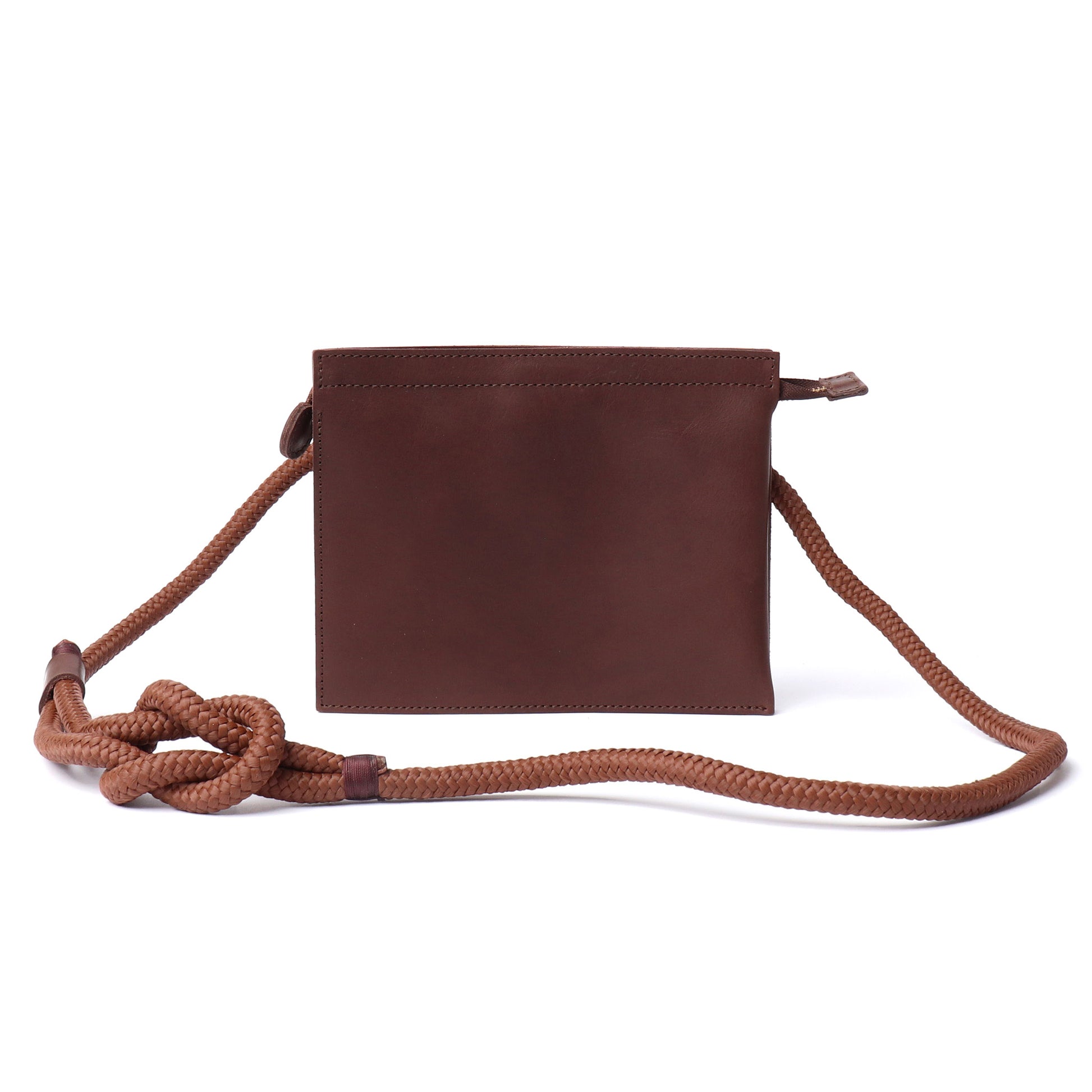 Leather rectangular zip bag with adjustable sailing rope to wear around waist or as cross-body sling bag. Bag comes with three compartments on the inside.